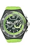 Orologio subacqueo, movimento giapponese al quarzo, cronografo con 24 ore e 60 minuti di contatori, lucido argento tono mani con accenti luminosi e cronografo secondi continui, indici a bastone luminescenti applicati con dettagli lucidi color argento, bianco numeri arabi e indici in bianco / nero mark contatori, Nero / bianco numeri arabi e indici segnano circostante pista minuto, datario analogico alle sei, quadrante nero con trattamento luminescente color argento applique logo, cinturino in silicone al neon verde con Po